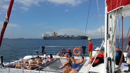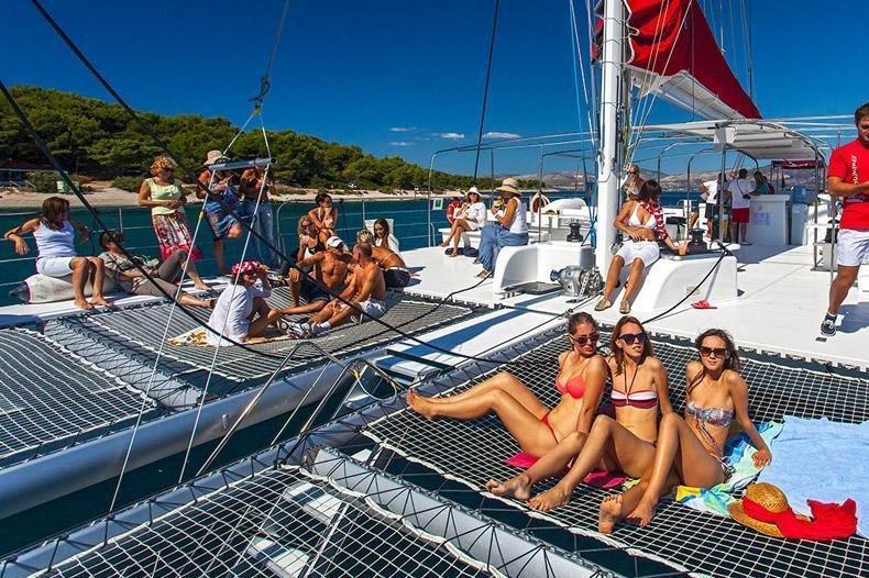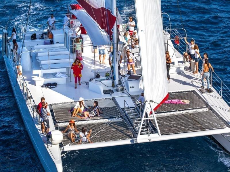 Relax and discover the art of sailing on board the biggest open boat of the city while you sunbathe, lay down and enjoy our big deck with huge nets and speakers. Our catamaran has shaded areas for those who need a break from the sun.