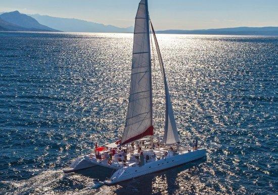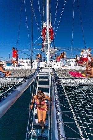After boarding, we sail around the island and make our second stop on the town side, where you'll be provided with transportation to the beach and be able to visit the small village of Taboga. You can also relax in the catamaran's big nets, enjoy the sun, swim, snorkel or use our floating noodles. You will be able to jump from the boat to the water too. After the town visit, lunch will be served on board of the catamaran and later, we'll sail back to port. If the wind is favorable during our way back the sails will be opened and the party continues!