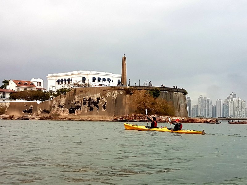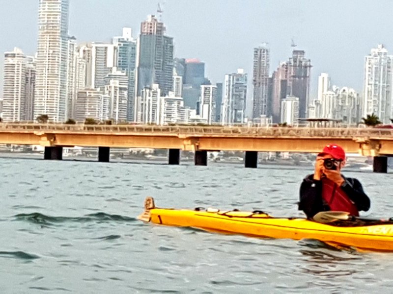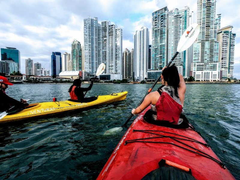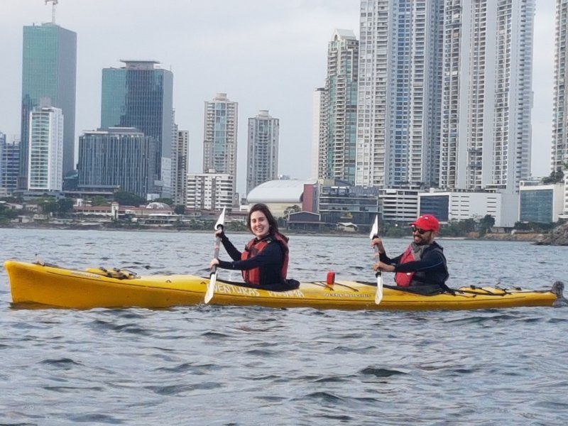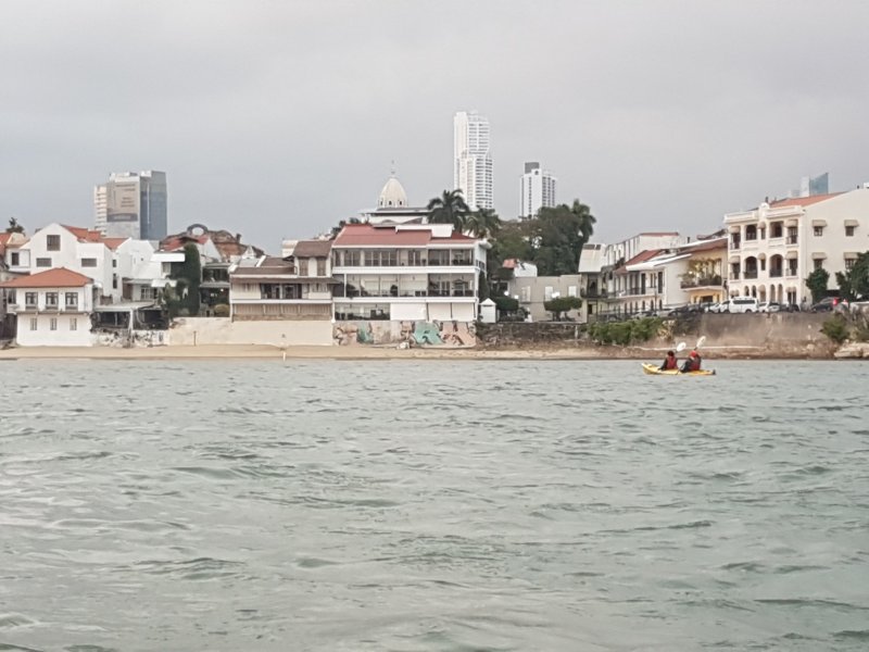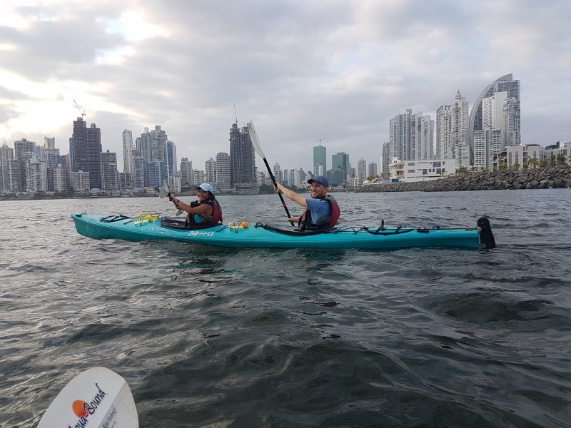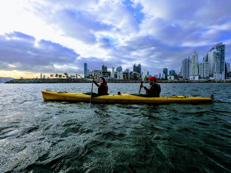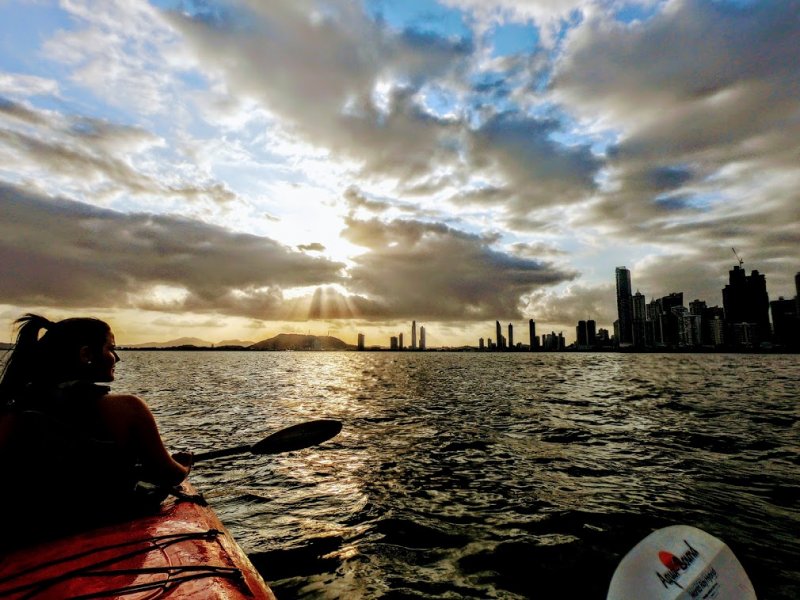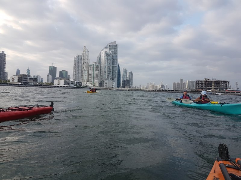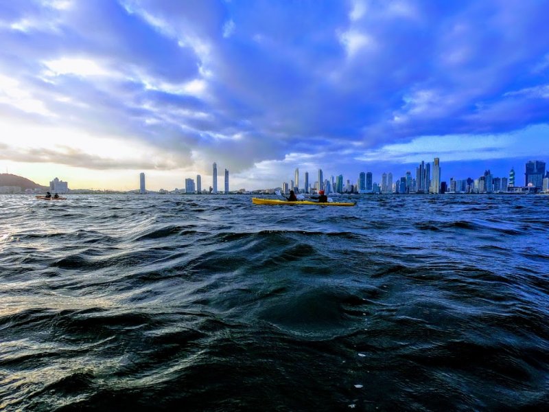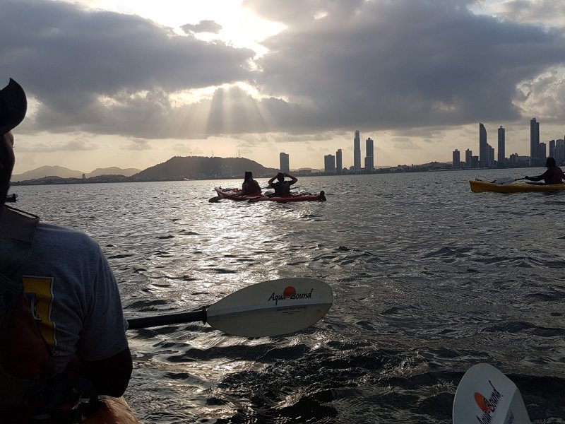 For the sunset kayaking we will start paddling at Punta Paitilla, and Punta Pacifica. Then paddle in front of the modern skyscrapers placed along the city ocean front by Cinta Costera or the Balboa Avenue in our right, and overlooking at the distance Taboga Island, Amador Islands, and vessels waiting their turn to enter the canal in our left hand with the Amador Coastway and Casco Antiguo in front.