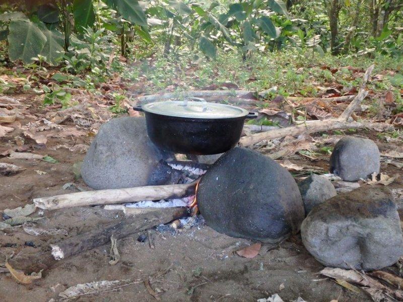 At 2:00 pm we arrived at the camp site. It was so dark that it looked like 6:00 pm and we knew that the persistent rain was going to be replaced by a storm so we set up camp as soon as possible. Yoselin set up his jungle hammock, Alexandra and I set up a tent and we all set up a tent where we made the dining room and kitchen. We look for wood and we set up the typical stove three stones.